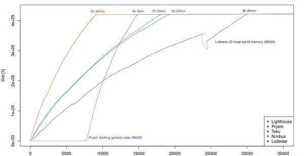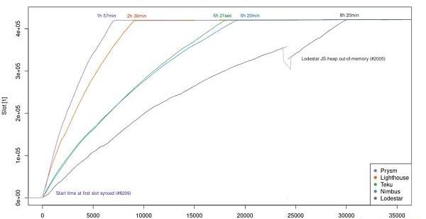 在上表中,通过比较客户端同步相同的slot需要花多少时间来比较其同步进程。在评选结果之前(虽然这不是本文的讨论范围),关于该图表我们需要知道三件事。
