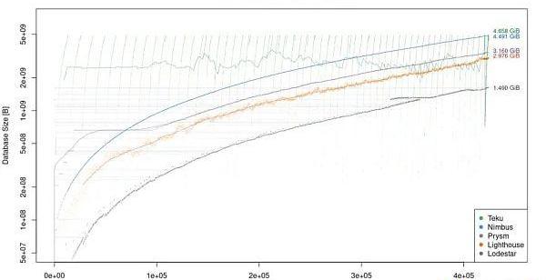 上面的图表中,随着同步slot的数量增加,比较各客户端的数据库容量。值得注意的是,关于完全同步主网节点(420_000slots),Lodestar的占用空间最小,总共只有1.49GiB。Lighthouse(2.98GiB)和Prysm(3.16GiB)的结果也不错。