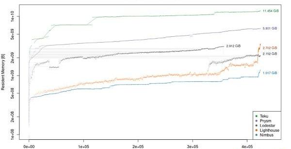 该图表相同,但是绘制了同步期间每个客户端的常驻内存集的大小。从图中得出,Nimbus客户端非常高效,在信标链主网的整个处理过程仅需要约1GiBRAM。紧接其后的是Lighthouse和Lodestar,均略低于3GiB。