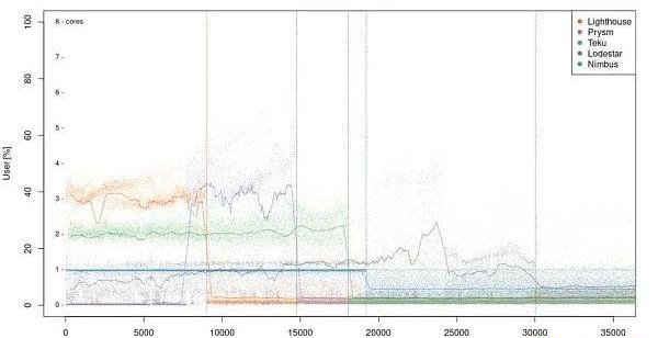 最后但同样重要的一点是,让我们看一下CPU的利用率。在上面图表中可以看到客户端之间的一些有趣差异。