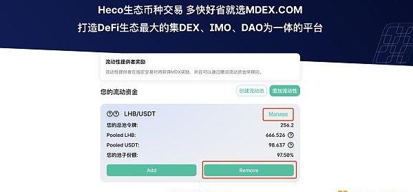 6、进入后,币种选择和输入质押的LHB和USDT的数量,最后点击,调用合约确认后,质押成功并获得USDT/LHB的LPToken
