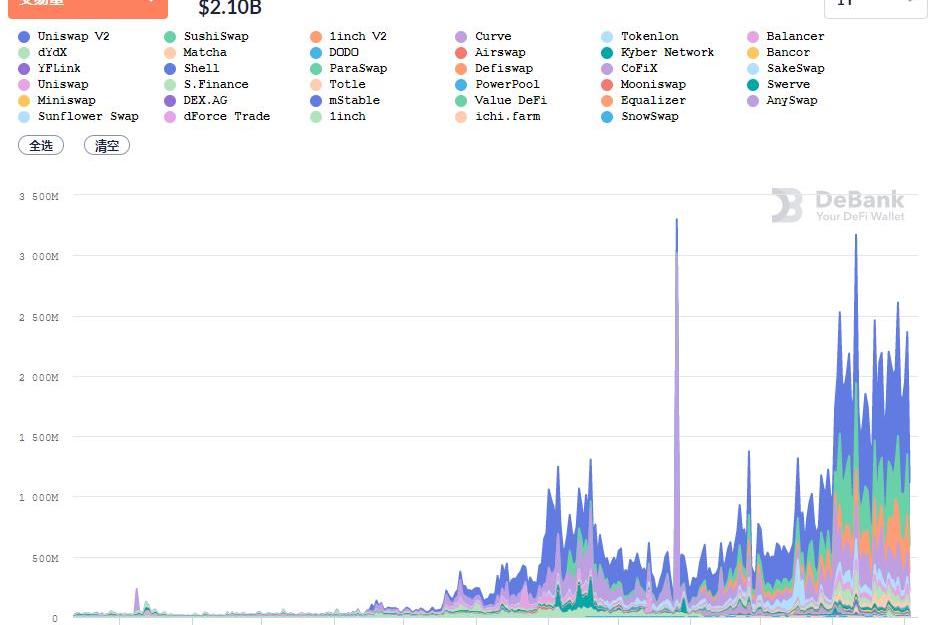 去中心化交易所的交易量在这一个月内创下历史新高,并且远超历史各个月的成交量。以UNI和SUSHI为代表的去中心化交易的平台币是这一个月表现最优秀的资产类别,在UNI和SUSHI的带领下,整个DEX版块普遍上涨。以太坊中的DEX已经形成了Uniswap与Sushiswap双雄并行的局面。因为流动性的优势,其它交易所很难再整体与这两个交易所进行竞争。