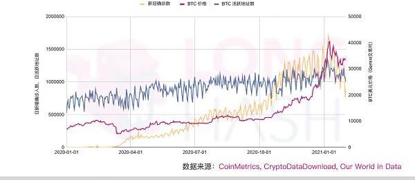 虽然图表让人觉得1月的暴涨是价格唯一相关的时刻,但数据却描绘了一个不同的故事。即使我们剔除2021年的所有数据,只看2020年的数据,比特币价格仍然与每天的新冠确诊人数紧密相关。相较比特币价格,活跃比特币地址数与新冠确诊数的相关性更紧密。换句话说,一切不变。