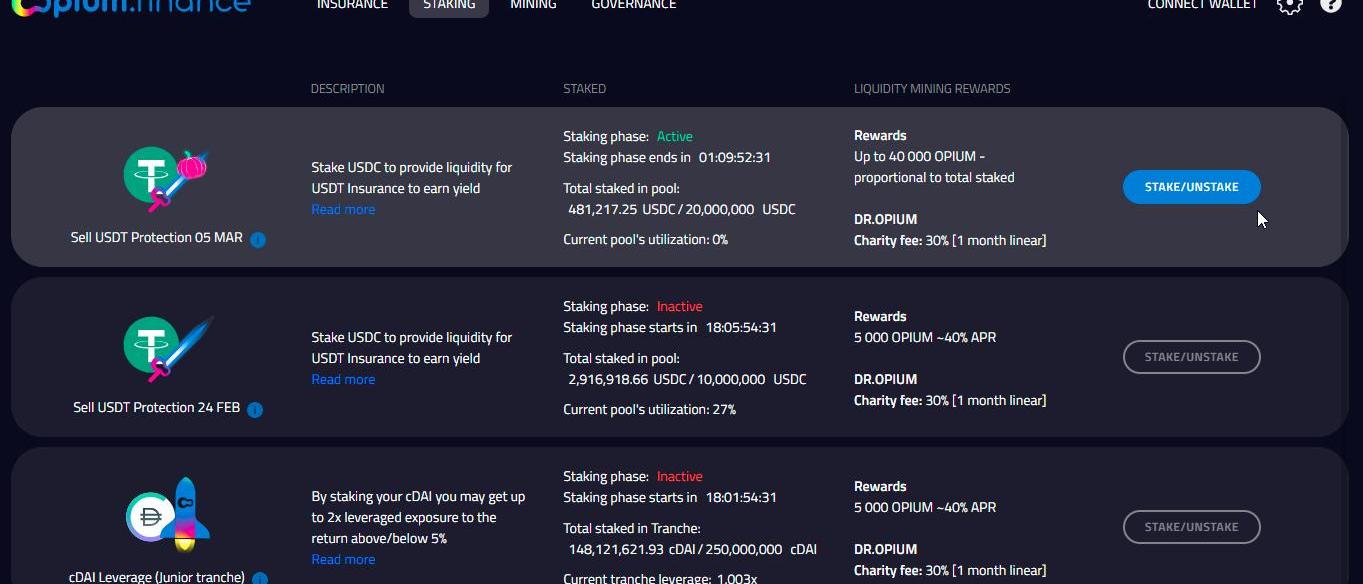第三个USDT保护池已经上线。点击进入OpiumFinance质押页面,向“USDTProtection05MAR”池添加流动性。