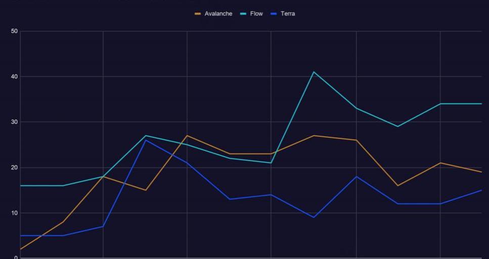 在过去一年中,Avalanche、Terra和Flow这三家公司的开发者数量急剧增加,其中Avalanche的周和月活跃开发者在过去一年增加了4倍,达到了Cosmos和Polkadot的50%左右。