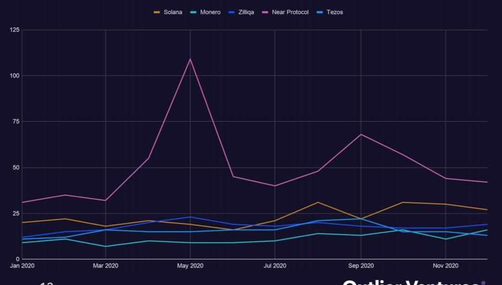 此外,包括Solana(36%)、Monero(35%)、Zilliqa(33%)、Tezos(30%)和NearProtocol(22%)在内项目的开发者数量也有所增加;NearProtocol在2020年4月底主网上线前后达到了一个强劲的峰值。