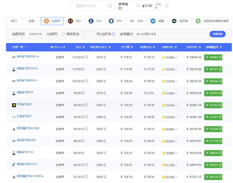 币印矿池的数据显示,超过90款比特币矿机的日收益超过10元,11种比特币矿机日收益超过100元。其中,神马矿机M30S++、蚂蚁矿机S19 Pro、神马矿机M30S+位列前三,日收益分别是149元、147元和130元。