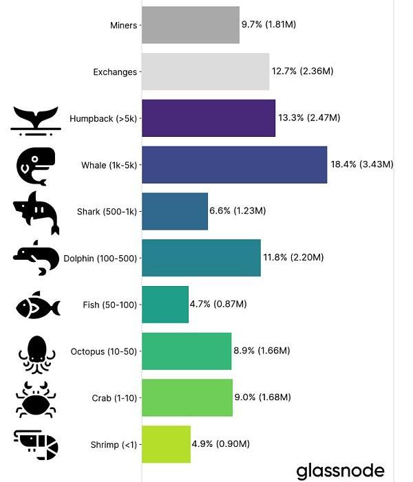 最小的三种实体的比特币加起来占比22.8%,这三种类型的实体很可能就是小型的个体持有者。交易所的比特币虽然存在交易所的地址上,不过这些比特币其实是属于用户的,如果把交易所的比例划分给最小的三种实体,那么该占比应该为35.5%,这个比例已经超过了鲸鱼和座头鲸的占比了,也就是说有相当一部分比例被小型个体持有着。
