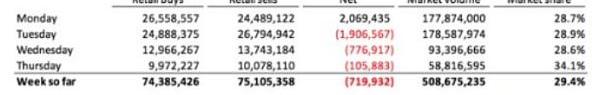 但最诡异的是,从Citadel看到的数据,散户居然是从周二就开始净卖空GME(周三以后也是净卖空,但不排除散户被迫平仓而distortdata)。所以散户真的是在疯狂做多么?