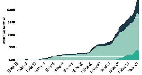 我们可以将以太坊网络上收取的每日交易费用总额作为衡量需求的标准,如下图所示。由于ETH是用来支付这些费用的商品,高交易费推高对ETH的需求,好比旅游热会推高对汽油的需求。值得注意的是,2021年一月的总交易费用差不多达到2018年一月高峰期交易费用的5倍。而ETH的价格也几乎接近于2018年的峰值。