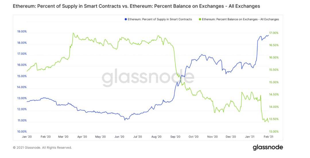 这两个关键数据之间有着密切的关联--一方面是交易所中以太坊的储备量下降,另一方面是智能合约中的锁仓量增长,这对价格起到了推动作用。