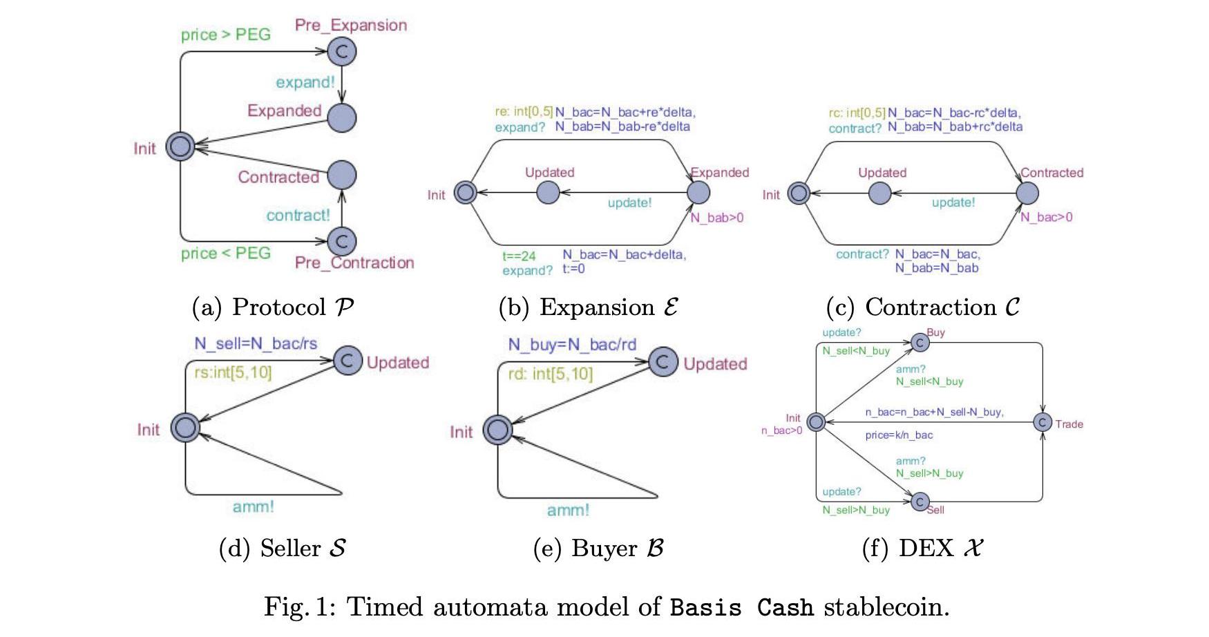 此外,M通过四类同步信道Ω提供通信:={ωe,ωc,ωx,ωu}。特别地,ωe和ωc被设计来触发扩张和收缩过程。ωx模拟市场交易活动,生成新的稳定成本价格。ωu在E、C和X之间同步更新。特别是,我们在图1中给出了BasisCash的正式模型。该框架适用于其他类型的稳定币。由于页面限制,我们选择了BasisCash,因为它体现了一种典型的模式,是在撰写本文时最受欢迎的市场之一。