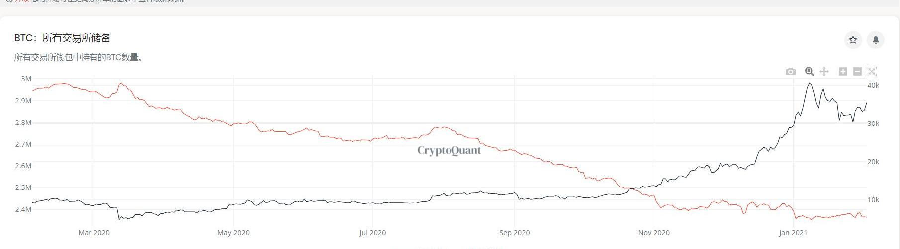 红线为交易所持仓量。而这两个数据是此轮牛市被谈及最多的一个“指标”。红线为交易所BTC、ETH持仓量,黑线为资产价格。从2020年8月左右开始,交易所的比特币和以太坊持仓量一直呈下降趋势。
