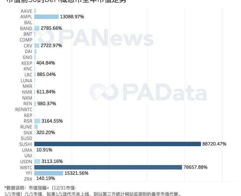 市值排名前30的DeFi概念币的币价平均上涨了191.33%。YFI和BAND是全年表现最好的两个DeFi概念资产。