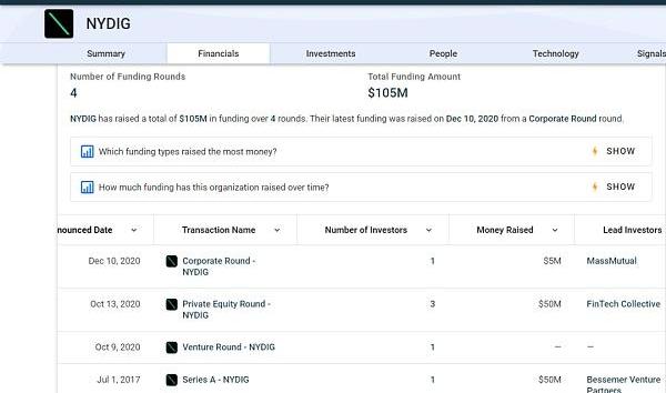 根据公开数据,NYDIG一共经历了4轮融资,总融资额1.05亿美金。在私募股权轮共有3家投资者:FinTechCollective领投,RibbitCapital、BessemerVenturePartners参投,共计5000万美金。去年12月11日,NYDIG又获得了美国万通保险公司的企业融资500万美金。