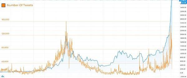 下图显示了过去5年中每日推文数量与比特币价格的对比图。我们可以看到这里形成了一个类似的趋势,Twitter的活跃度会随着比特币价格的大幅波动而激增。