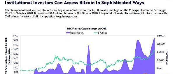 芝加哥商品交易所(CME)的比特币未平仓合约,或者说期货合约的总流通价值在2020年10月创下历史新高,其2020年增长了10倍,达到近10亿美元。融入既有的金融基础设施,CME让各种风险偏好的投资者都能获得风险敞口。