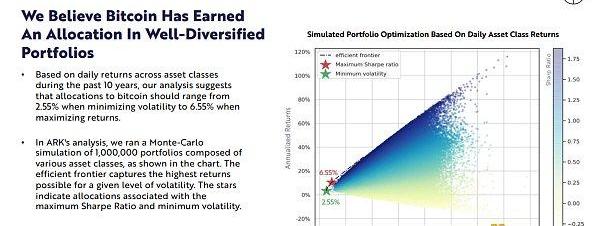 基于ARK对投资组合的模拟,机构投资者在2.5%至6.5%之间配置其资产,可能让比特币的价格升至20万美元到50万美元。