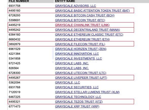 经查询特拉华州政府官网,出现了疑似与灰度有关的信托实体,分别为「GRAYSCALEBASICATTENTIONTOKENTRUST(BAT)」、「LINK」、「MANA」、「FIL」、「LPT」、「XTZ」六个信托实体。