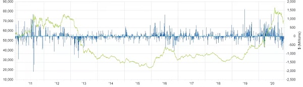 但是这两种趋势并不一定是相关的。如下图所示,从历史上看,黄金基金的资金流出并不罕见。