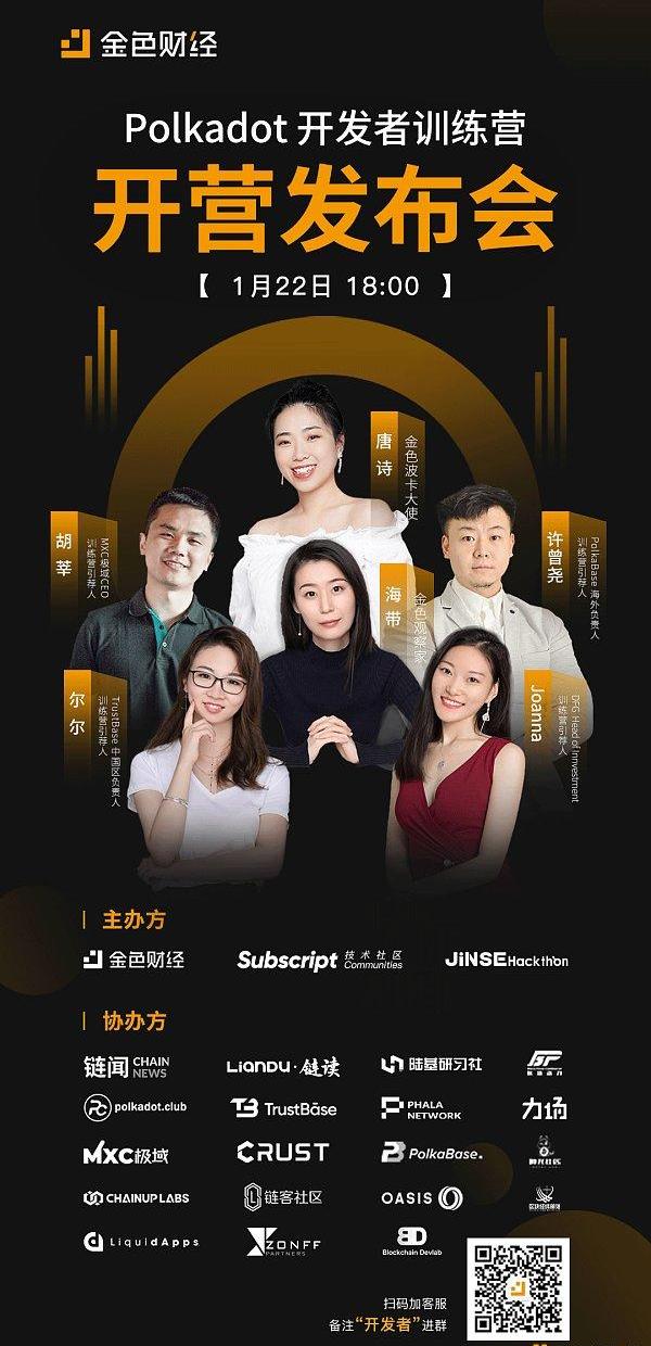 [Polkadot开发者社区训练营是训基于PolkadotSubstrate框架及Subscript智能合约语言的开发培训营,由金色财经发起,金色Hackthon、Subscript开发者社区主办。