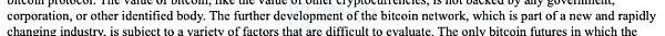贝莱德还在说明书中警告投资者,比特币期货的投资可能存在流动性不足的风险,监管变化、波动性和估值风险同样会对价格造成压力,从而「对基金产生负面影响」。