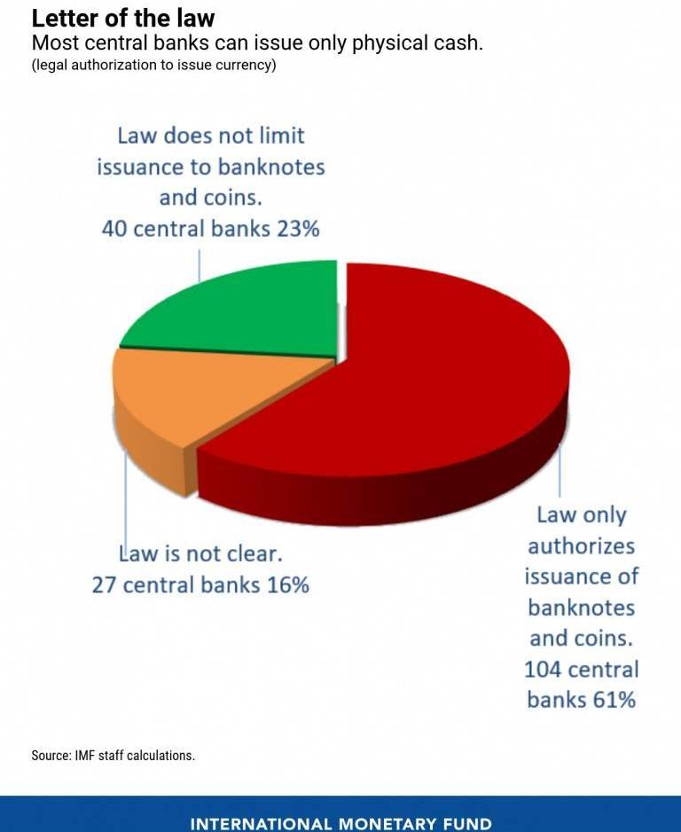 但是,事实上,世界上近?80%的中央银行要么根据现行法律不允许发行数字货币,要么相关法律框架不明确。为了帮助各国做出这一评估,我们在一份新的?IMFstaff?报告中审查了?174?个?IMF?成员国的央行法律,结果发现只有大约?40?个成员国在法律上获准发行数字货币。