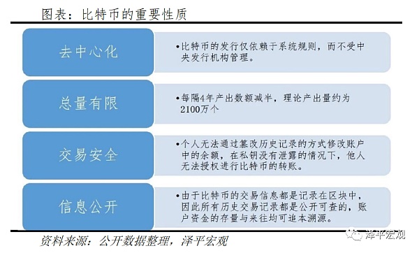 比特币主要具有四大特征:系统设定发行方式,不存在中央发行机构;年发行数量每四年减半,最终总量有限;余额信息难以篡改,交易安全有保障,系统整体稳健性强;历史交易记录公开。