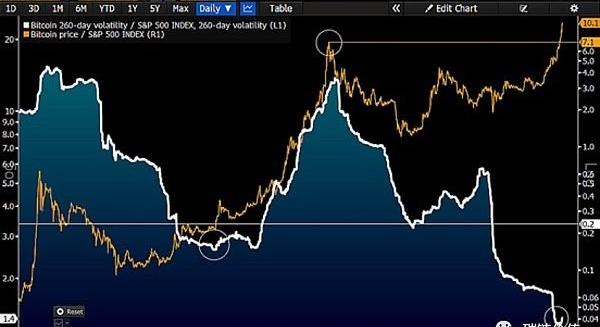 1、2016年,比特币260天波动率低点相对于标普500指数大约是2.6倍。