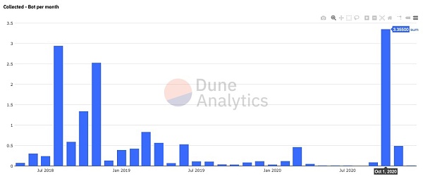 利用 Dune Analytics 工具,我们可以看到这个机器人自 2018 年 5 月开始运营以来收获颇丰。