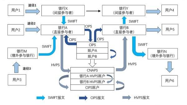 途径①:用户1---CIPS间接参与者---SWIFT---CIPS直接参与者---CIPS---CNAPS