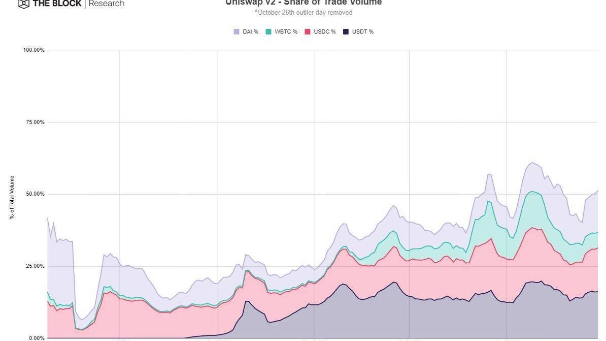 由于没有上币门槛,因此DEX通常对于DeFi资产的长尾来说是有利的。任何人都可以上线资产并开始提供流动性。尽管如此,这种交易量仍是集中的,因为Uniswap上排名前四的交易对占交易量的50%。为了比较,这仅略低于例如CoinbasePro,该平台前四个交易对约占总交易量的60%。