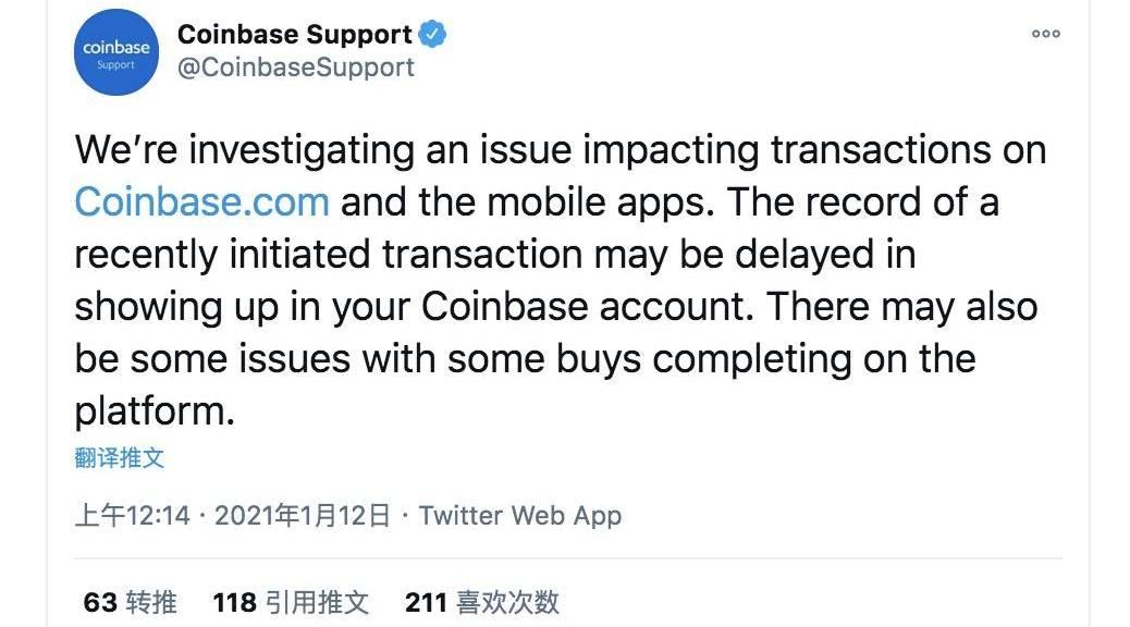 我们正在调查一个影响了http://Coinbase.com和移动应用上的交易的问题。最近启动的交易记录可能会延迟显示在你的Coinbase帐户中。在平台上完成一些购买可能还会有一些问题。