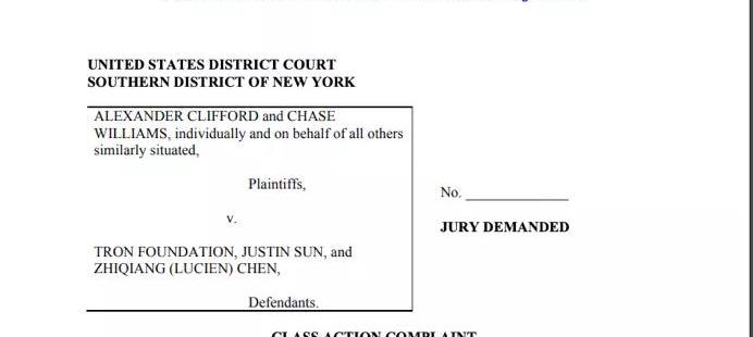 起诉的原告是美国伊利诺伊州芝加哥市居民AlexanderClifford和德克萨斯州休斯顿居民ChaseWilliams。他们诉称购买了波场代币TRX,事后认为TRX属于证券,但波场没有将其作为证券在SEC注册,也没有资格豁免注册要求,误导投资者买入TRX,违反了美国联邦和洲证券法。