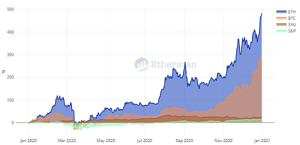 ETH 的表现超过了 BTC、黄金和标准普尔 500 指数等主要资产。截止 2020 年底,ETH 的涨幅为 483%,不仅打败了 BTC(+303%),还令黄金(+24%)和标准普尔 500 指数(+15%)望尘莫及。