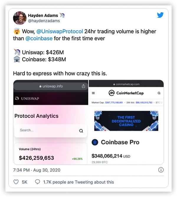 纵观 DEX 市场和 Uniswap 的爆炸式增长,当初整个 DEX 市场的月交易额只有 1.66 亿美元,如今才过 8 个月,Uniswap 的日交易额就已超过 Coinbase。