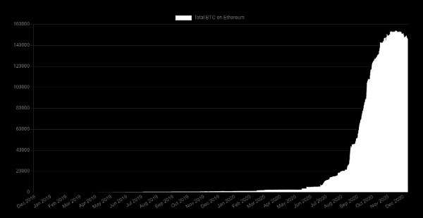 2020 年的另一个趋势是以太坊区块链上的 BTC 代币化。当我们在 6 月 1 日的文章中分析这一话题时,我们预期会有一波 BTC 代币化热潮,之后就有 5000 BTC 被代币化。过去 6 个月来,这个数字增长 27 倍,达到 14 万 BTC。