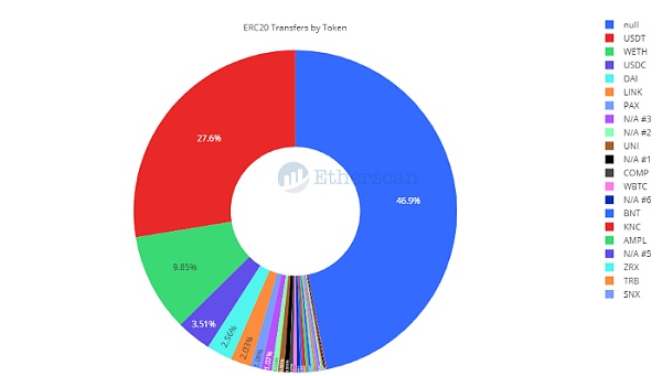 在使用率上比稳定币低一级的是 DEX 代币。前 20 中有 4 种 DEX 代币(UNI、BNT、KNC、ZRX),总占比达 1.3%。