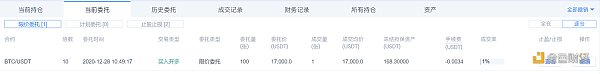 1、用户认为近期行情在17000USDT附近是一个支撑点,可以进行买入开多交易。此时用户可以先设置限价委托,同时设置止盈止损的策略委托。