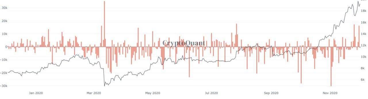自从创下历史新高以来,比特币价格一直无法突破19400美元来获得支撑。这很可能是由于鲸鱼有可能在19400美元至19600美元的范围内大举抛售,以防止历史最高价被突破。在历史高点之上,几乎没有阻力,直到达到新的上限。