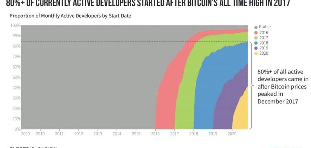 12月11日消息,据加密资产管理公司ElectricCapital在今日发布的一份《2020年加密生态开发者报告》显示,比特币和以太坊生态系统的开发者较3年前分别增长了70%和215%,此外,自2020年1月份以来,去中心化金融项目的月活跃开发者增长67%。