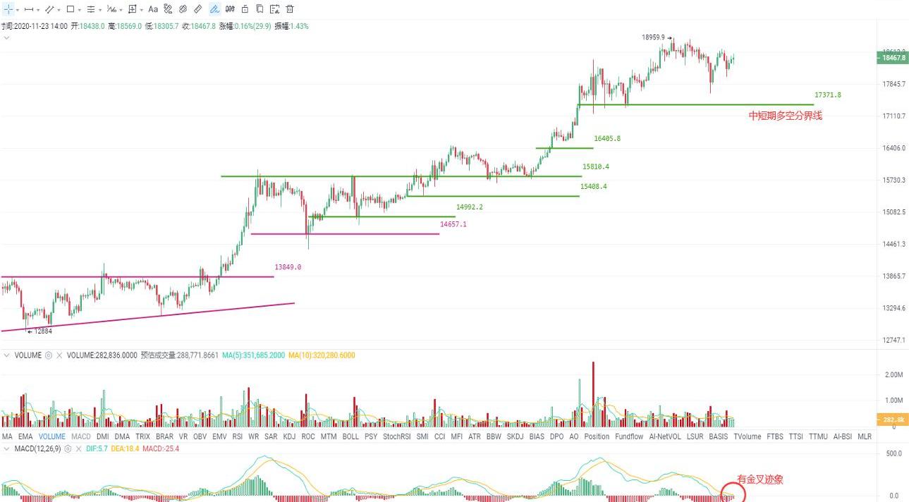 目前对于比特币来说,最关键的位置依旧是17370一线支撑,该价位现在可以看作中短期多空分界线,在没有明确跌破之前意味着,长、中、短各级别走势依旧在完好的多头趋势中,那么继续持仓待涨依然是主要操作思想。新仓还是以低吸为主,这种机会不是没有,而且是经常有,比如周末这波好多都出现大阴线了。我们在群里交流的时候经常讲,在大趋势确立的时候,不追涨,逢大跌就低吸,风险小,成功率高。