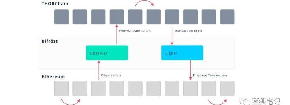 跨链状态锚定连接主链和THORChain,这个机制并没有将资产锁定,只是锚定链的状态,也称之为单向状态锚定。其中,每个连接的链都有一个「Bifr?st」模块,它可以处理连接到该链的细节,如链配置和交易详情。节点完成同步后,他们会监视每条链上资金库地址,如果他们看到所监视的Vault地址有相关的进入交易,他们会将其转换为THORChain的见证交易。无论交易类型如何,每个链的见证交易参数基本相同。THORChain处理每个观察到的交易,并收集签名者。一旦绝大多数节点同意特定的交易,它将从等待状态转换为最终状态。简单来说,THORChain节点观察到其他区块链交易,然后通过节点的共识证明该交易的发生。