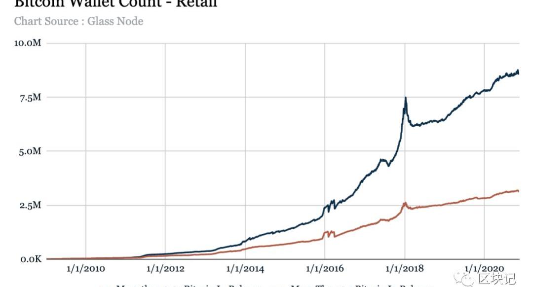 为了了解比特币的用户群体是如何增长的,我们将其分为个人和巨鲸的钱包。这让我们了解到生态系统随着时间的推移是如何演变的。如果个人没有参与生态系统,这意味着没有"新币"或采用率出现。如果巨鲸钱包急剧减少,这可能表明人们对比特币的货币性缺乏信念。这里的数据就能说明问题。我们发现在小额钱包中自2017年以来一直在持续增长,并创造了新的高点。事实上,日活跃钱包数量在11月18日创下了历史新高。