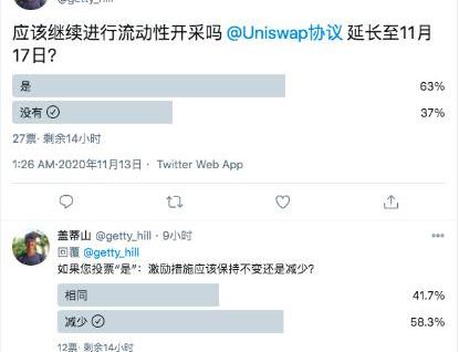 讨论过程中,一名社区成员在推特实时开启了相关投票。在「是否继续挖矿」的选项中,有27人参与投票,63%的人选择了「是」;在「如果继续挖矿,激励措施应保持不变还是减少」的投票中,12人中的58.3%投了「减少」。