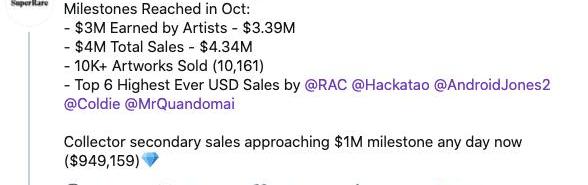 虽然根据其网站的说法,SuperRare只入驻了「少量精挑细选的艺术家」,但它的生意却做得很大。2020年10月,SuperRare报告说,其平台上的艺术品销售额为400万美元,艺术家卖出了超过1万多件艺术品,赚了300万美元。
