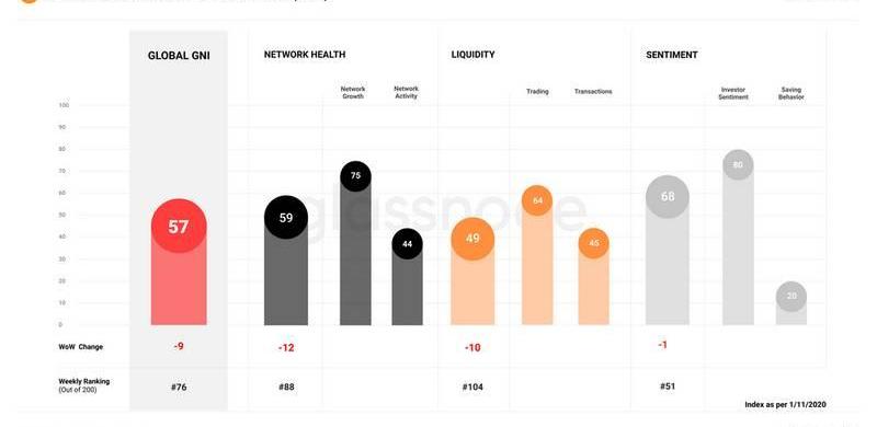第44周,尽管BTC价格上涨,但比特币链上基本面下降。GNI下降了9分,使其得分达到57分。所有的子指数都有所下降,但下降主要来自网络健康和流动性,而市场情绪则指数则保持相对稳定。????