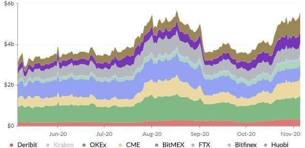 比特币期货的统计范围包括BitMEX、币安、Bitfinex、Bakkt、Bybit、CME、Deribit、FTX、火币和OKEx。以太坊期货的统计范围包括BitMEX、币安、Bitfinex、Bybit、Deribit、FTX、火币和OKEx。