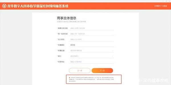 商事主体可通过PC端登录龙华政府在线-龙华数字人民币春节留深红包预约抽签系统或通过“i龙华APP”预约平台或“i龙华”微信小程序预约平台进行商事主体注册申请,提交留深人员资料。PC端网址: