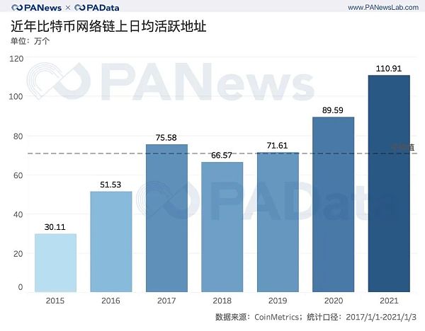 今年,链上日均活跃地址数达到了近年来的一个小高点。根据统计,今年日均活跃地址数较2019年上涨了约25.11%,较上一轮牛市时期的2017年上涨了约18.54%,较五年前的2015年则已经翻了近3倍。